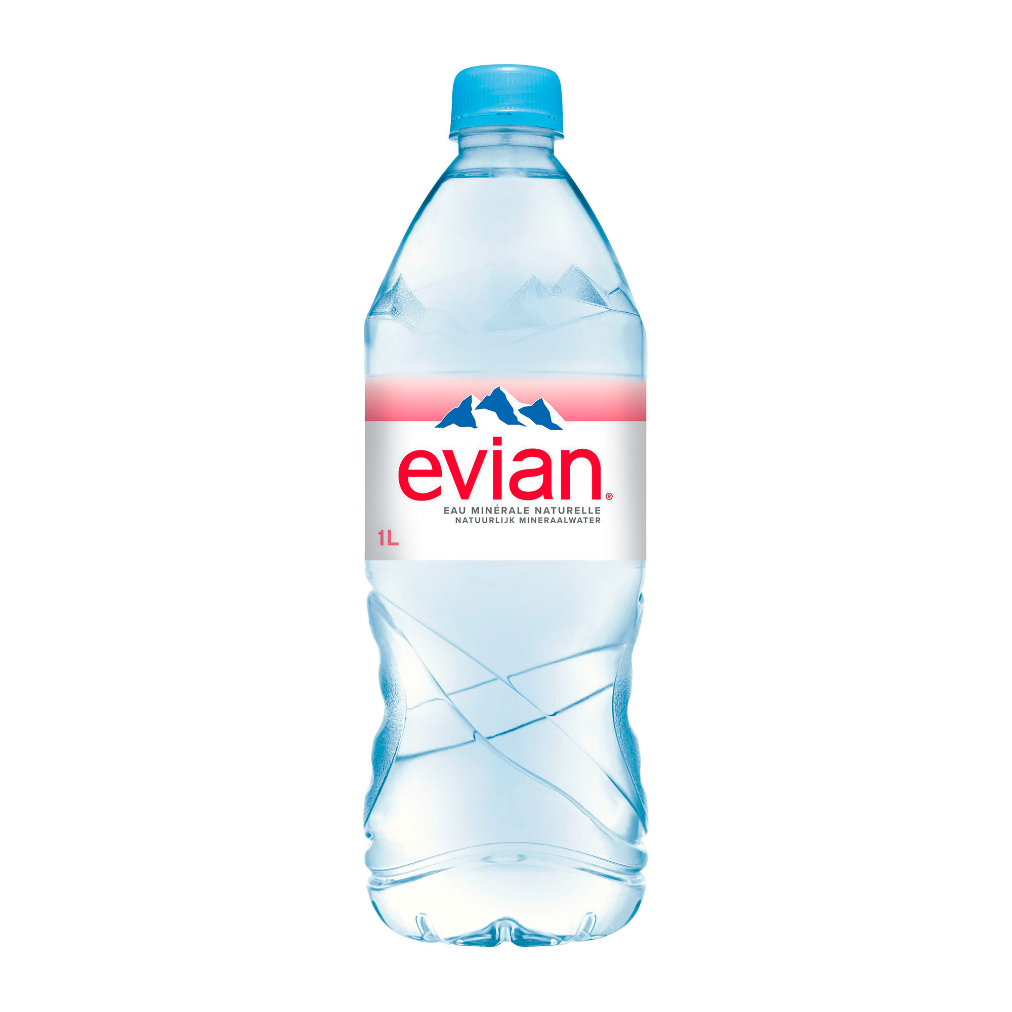 Flat mineral water Evian. Born in the heart of the Alps, from a protected source, the water is pure and 100% natural.