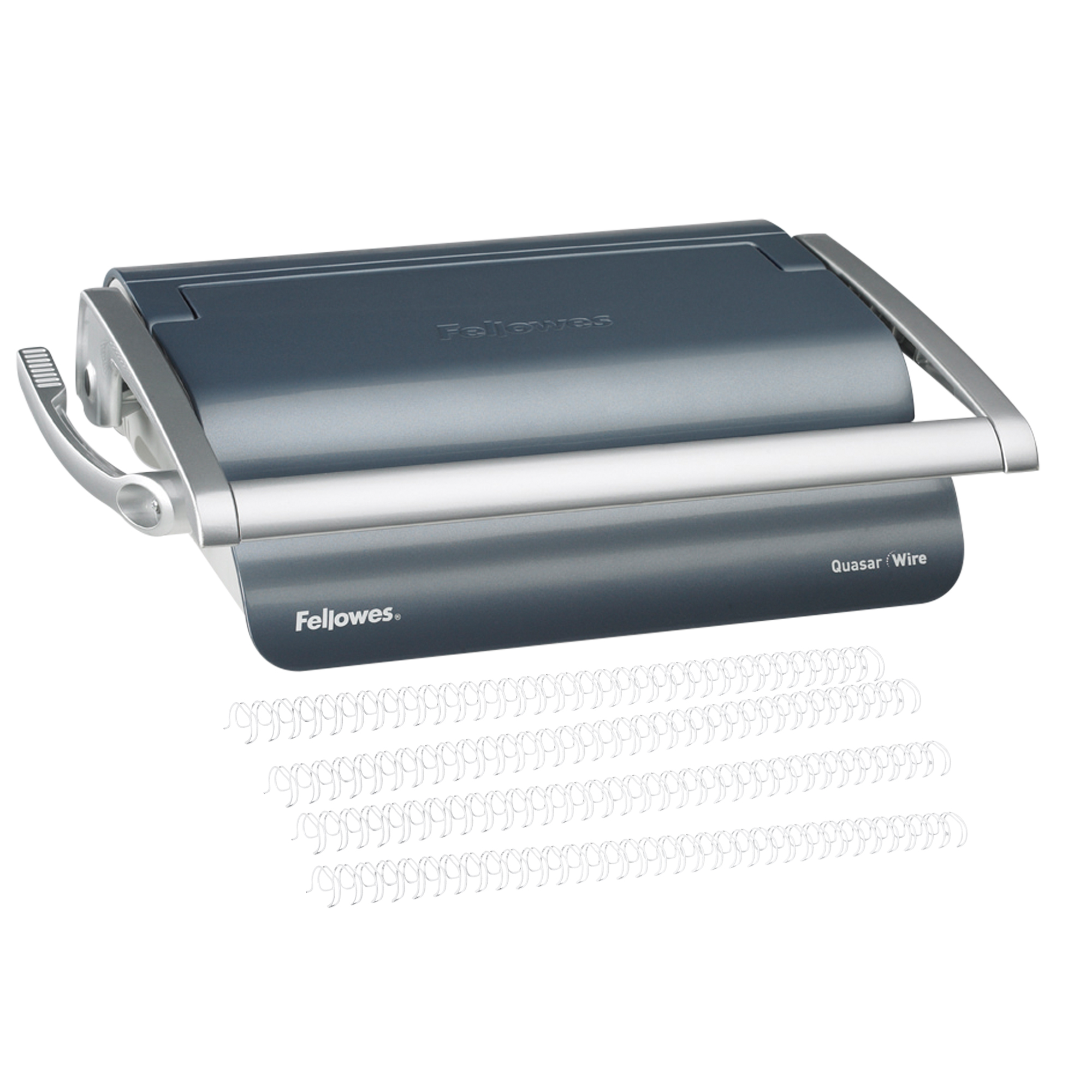 -Binding machine Quasar Wire: perfores up to 15 sheets and binds up to 130 sheets. To be used with metallic binding rings with 34 rings. Effortless vertical perforation thanks to the transversal bar, adapted to all consumers. For frequent use. Selection of ring diameter for a fast choice. Confetti drawer with automatic opening, in order to avoid blockage. Adaptable rear aligning guide for a precise centring of the document. Storage tray. With kit for 10 bindings. Dimensions: H 18 x W 52 x D 47,5 cm. Weight: 9 kg.