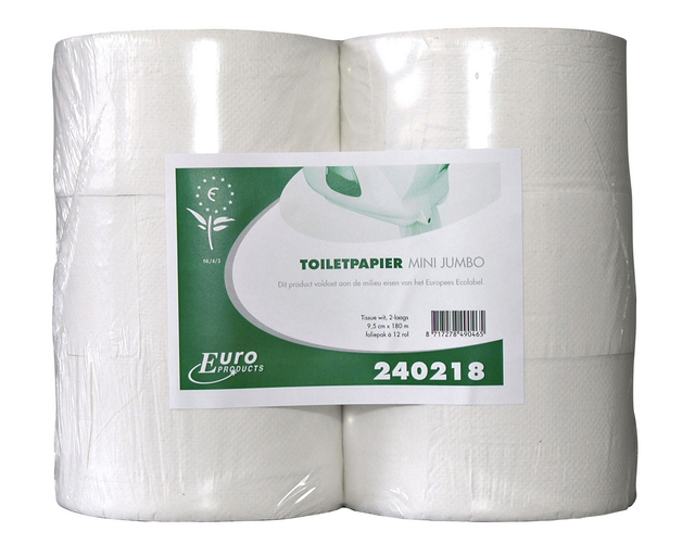 * Le papier toilette Euro Mini jumbo recyclé est efficace à l’usage et contient plus de papier toilette qu’un rouleau traditionnel. * Le papier toilette Mini Jumbo se compose de 2 épaisseurs et est universel. * Le bon choix pour les espaces sanitaires très fréquentés. * Capacité: 180 mètres par rouleau, équivalent à 4-5 rouleaux traditionnels. * Excellent pouvoir absorbant. * Doté du label européen ECO. * Soluble dans l’eau. * Longueur rouleau: 180m. * Largeur rouleau: 9,2cm. * Diamètre rouleau: 19cm. * Papier 2 épaisseurs. * Nombre de feuilles: 720. * Paquet de 12 rouleaux.