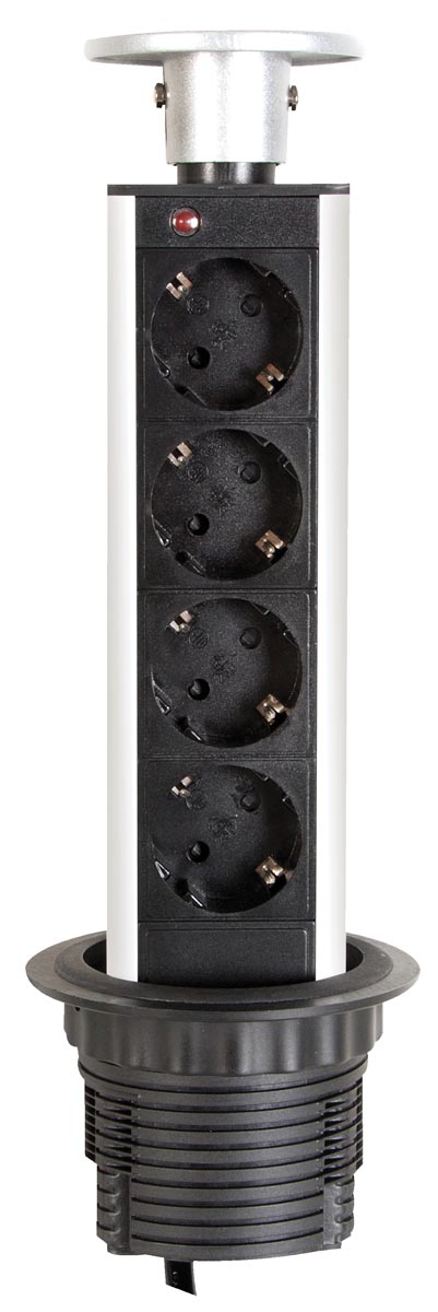 Bloc avec 4 prises escamotable, terre Belgique. Ce bloc permet d'encastrer 4 prises dans le plan de travail d'une cuisine ou d' un bureau. Dissimulé à l'intérieur de votre plan de travail, un simple appui sur le bloc suffit pour le coulisser partiellementou totalement lorsque vous avez besoin d'une prise. Esthétique, pratique, robuste, discret, il s'intégrera parfaitement dans votre environnement. Caractéristiques: protection enfants, avec indicateur, type de prise française, type de prise: terre française (type E). Spécifications, diamètre de préperçage: 64 mm (usage 76 mm scie de trou), nombre de prises: 4, câble: H05VV-F 3G1.5, longueur du câble: 2 m, puissance max.: 3.500 W.