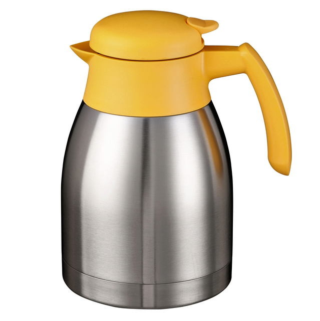 * Ce pot isotherme en inox conserve les boissons longtemps à température qu’elles soient chaudes ou froides. * Intérieur et extérieur en acier inoxydable. * Grâce à son clip pratique, vous pouvez verser le liquide rapidement. * Niveau élevé d’isolation et confort pour verser. * Contenu de 1,5 litre. * Partie supérieure en jaune pour servir le thé ou l'eau chaude. * Dimensions (lxH) : 145x200+20mm, le couvercle fait 20mm.