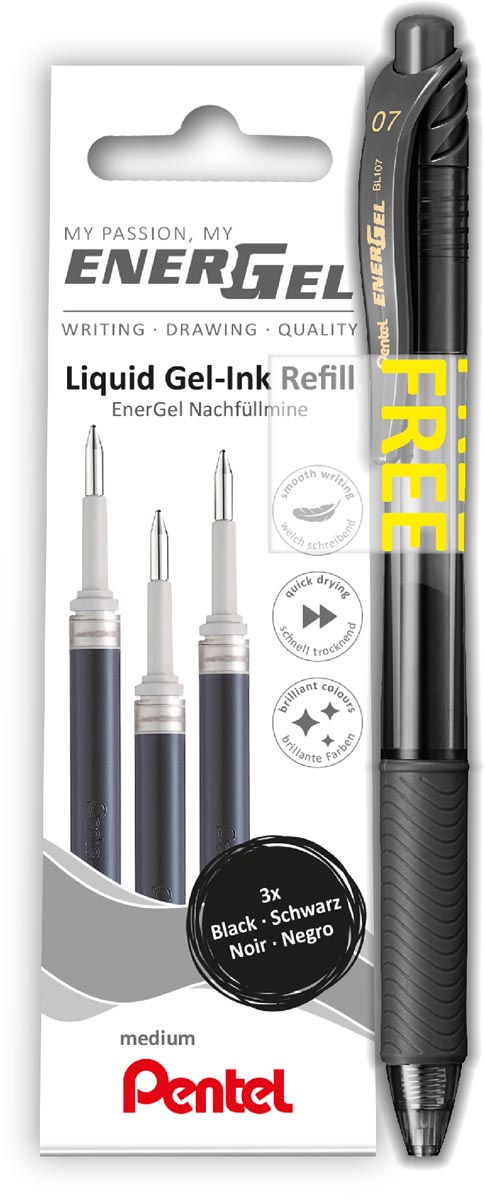 * Pack promotionnel spécial du célèbre Pentel Energel Roller : stylo gratuit avec 3 recharges! * Pour une écriture fluide, sèche rapidement et ne fait pas de bavures. * Largeur d'écriture : 0,4mm. * Blister en carton de 3 recharges.