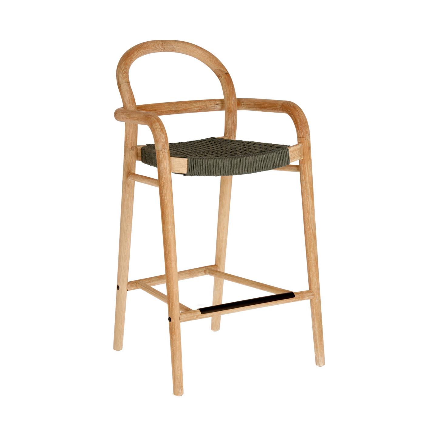 Carlos Guijarro has designed this Sheryl stool, 100 cm high, for Kave Home. A handmade piece made from eucalyptus wood with a natural finish. Each stool has its own unique veins and tones, due to being solid wood, so it is exclusive and unrepeatable. Manual joinery techniques have also been used, such as steam wood bending, to create the structure. The chair, in green, is also hand braided combining round and flat rope, making it more uniform and stable.