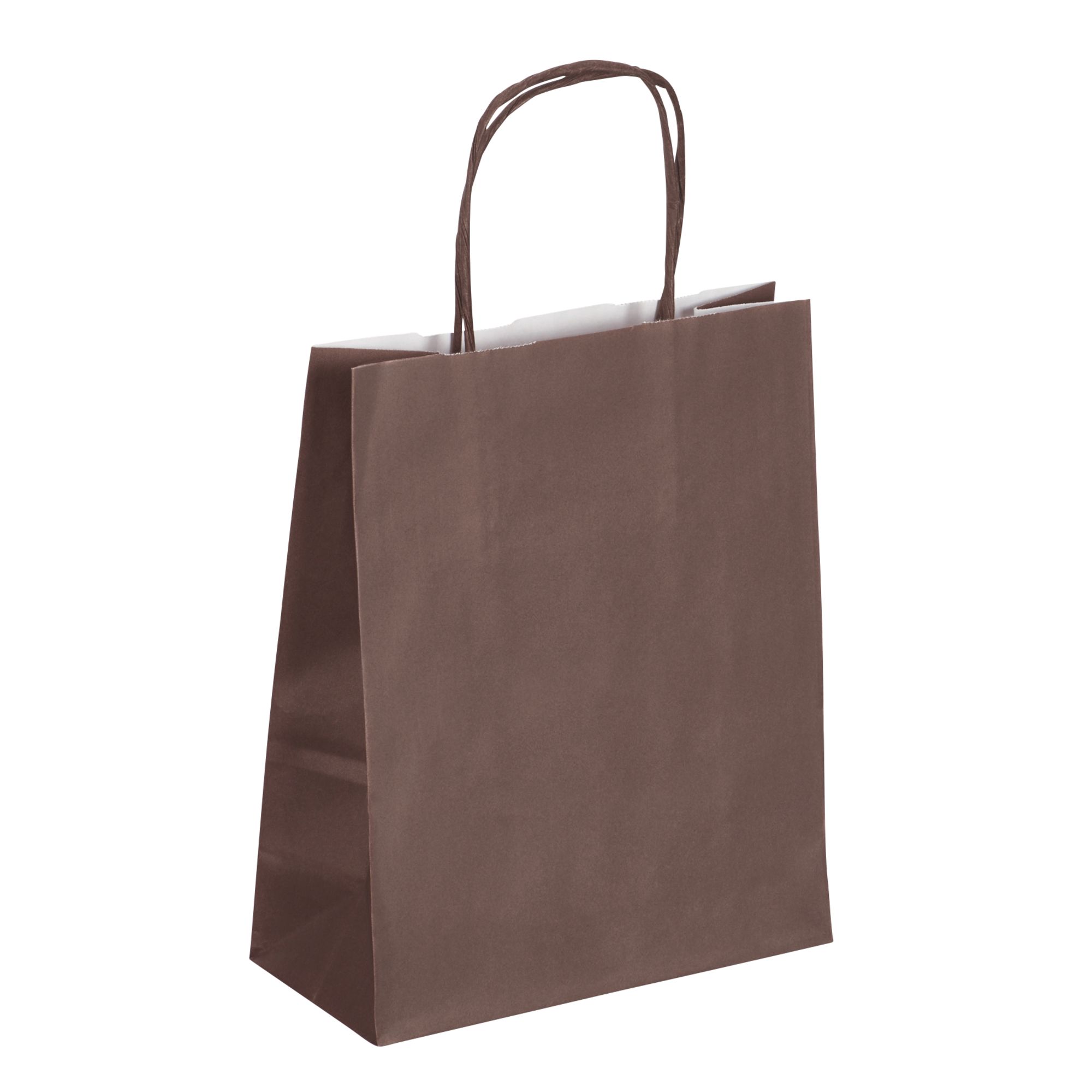 Detailled descriptionSac en kraft avec poignées papier torsadées : Dimensions : H 22 x L 18 x P 8 cm 90 g/m² d'épaisseur 100 % recyclable Résistance 5 kgLot de 50 sacs.