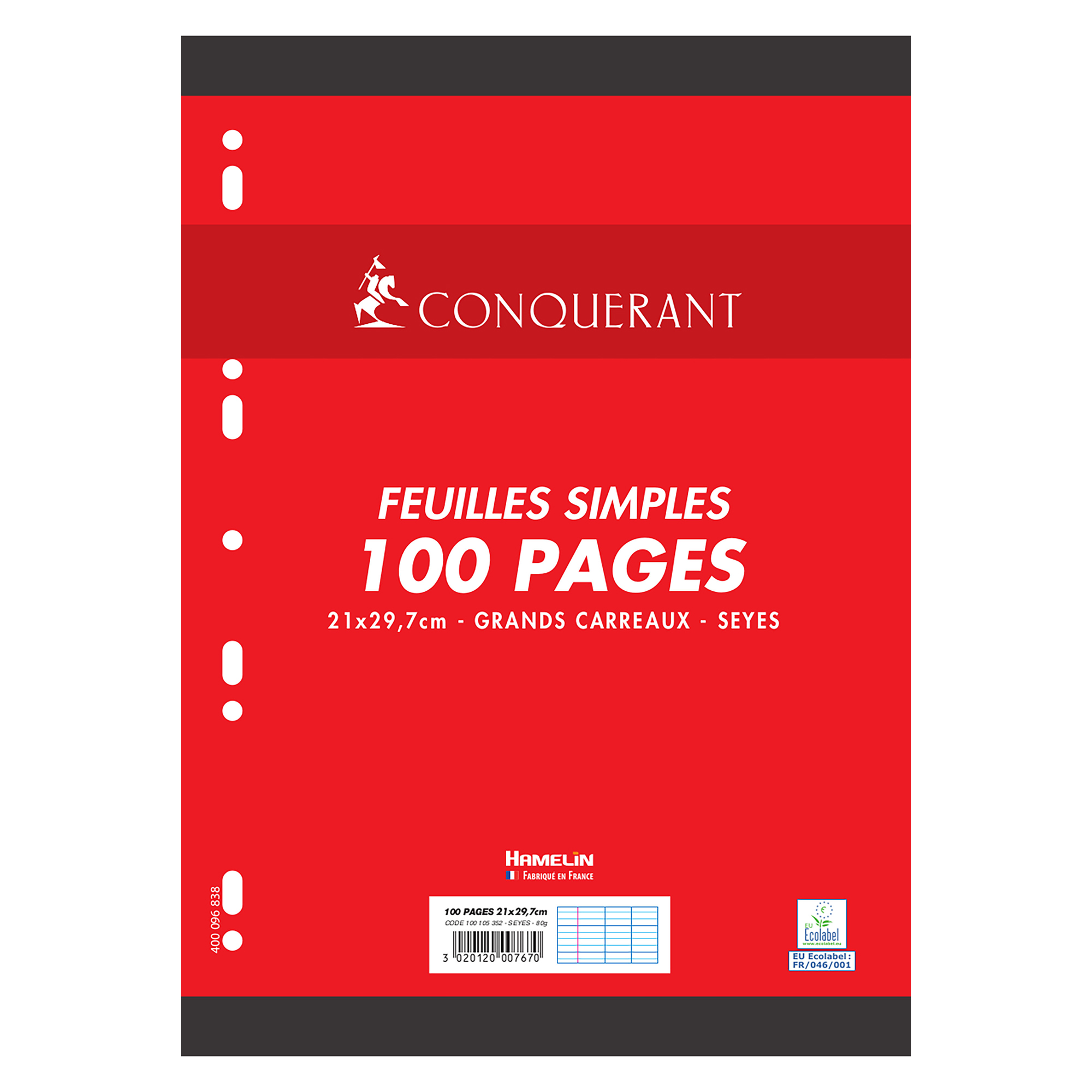 Toujours utiles les feuillets mobiles simples Conquérant, une fourniture intéressante pour vos prises de notes, en cours, au bureau... Avec une réglure imprimée Séyès, grands carreaux, en papier blanc 80 g et leurs perforations universelles, ces copies simples présentent une compatibilité avec tout type de classeur.