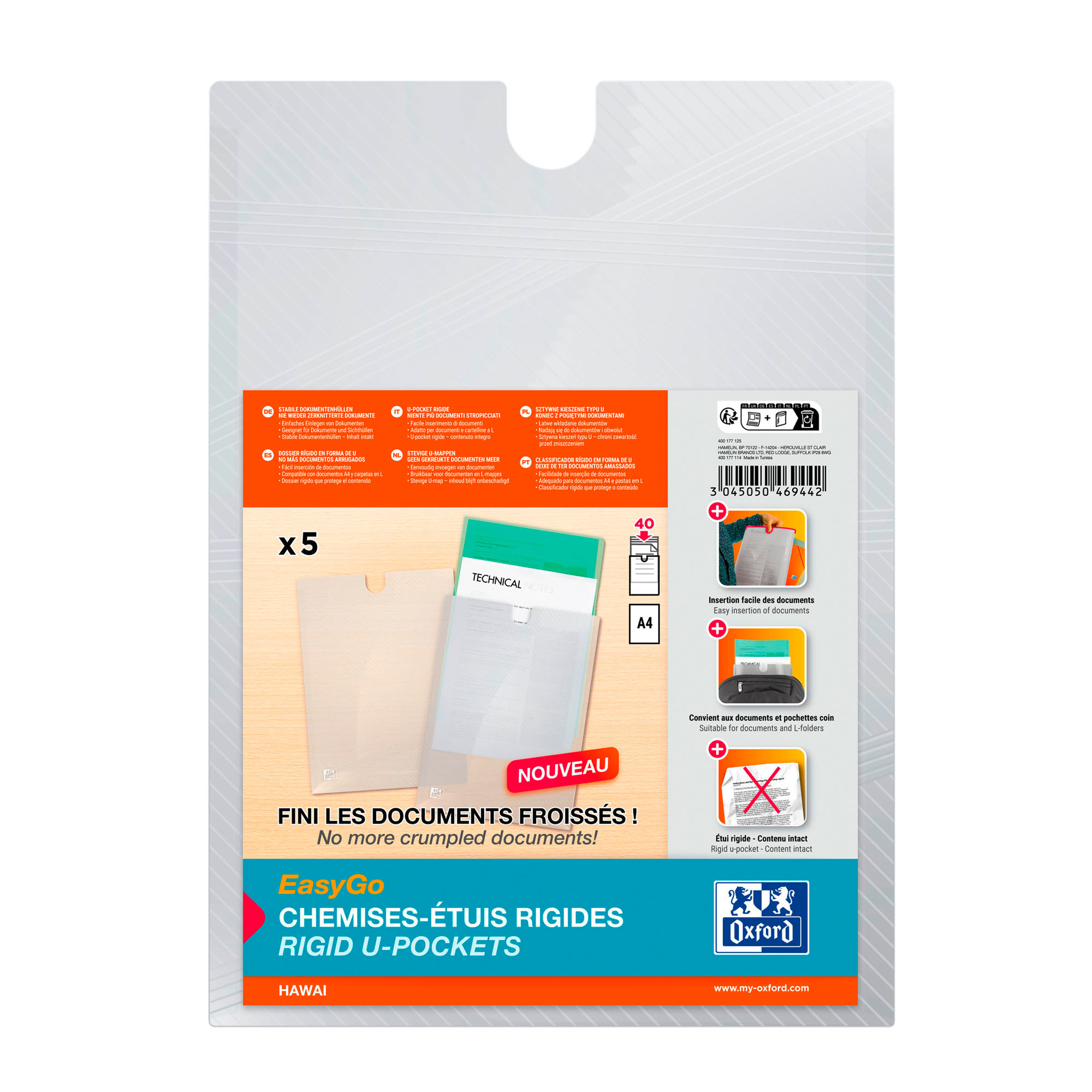 Detailled descriptionEnd of crumpled documents or folders thanks to their rigid polypro cover. Rigid cover in translucent polypropylene, thickness: 3/10thA4 format for storing sheets and corner pocketsAccess your documents easily thanks to their "thumb cut" opening and their portrait formatThey will slip into your bag or between two folders to go to a meetingCapacity of 40 documents on averageThey are available in pack of 5 folders-translucent cases