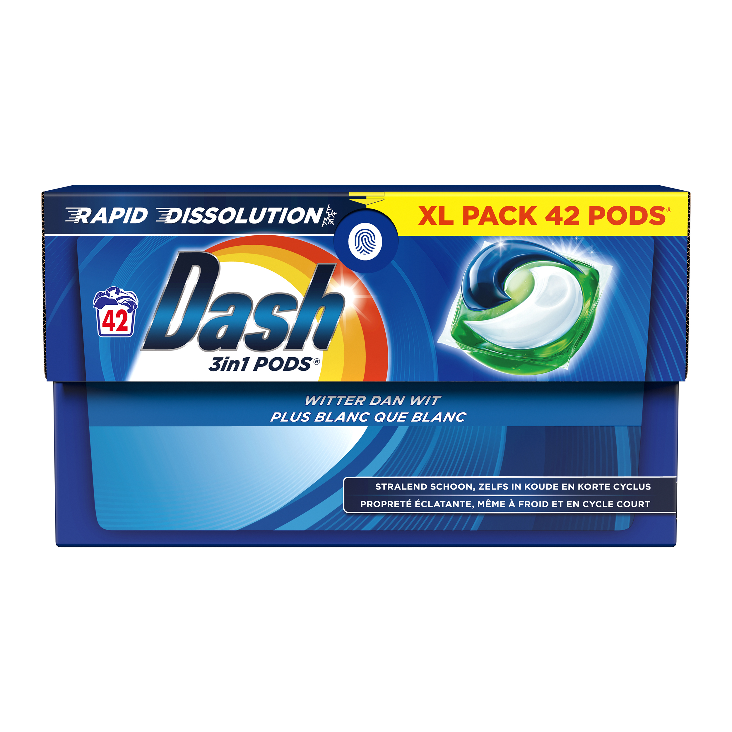 Dash All in 1 capsules de lavage, lave plus blanc que blanc, nettoie les cristaux et laisse une odeur irrésistible, même à basse température.