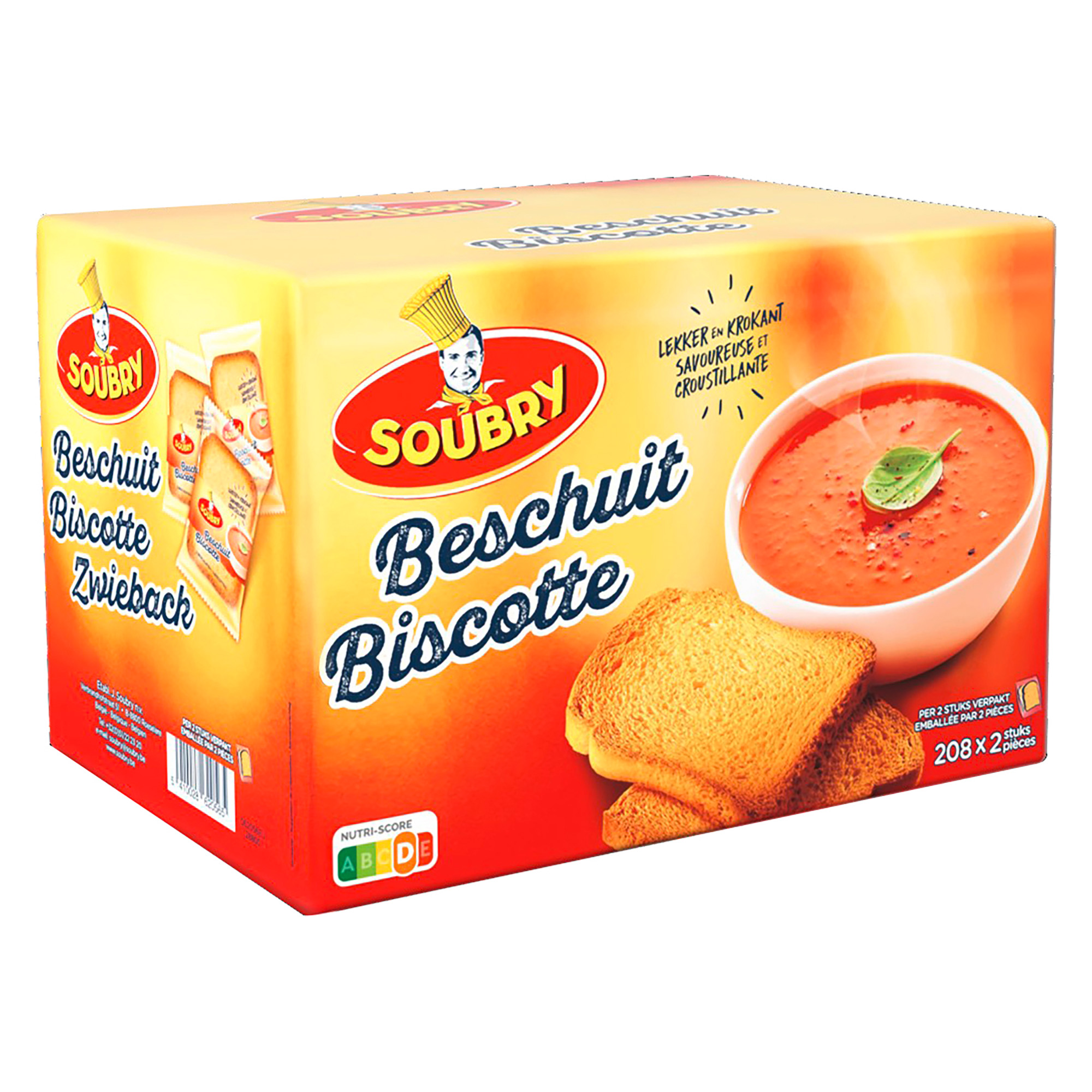Detailled descriptionIdeal with a soup or as a healthy snack.Individually packed in a set of 2.Box of 208 packs of 2 rusks (2 x 7.5 g).