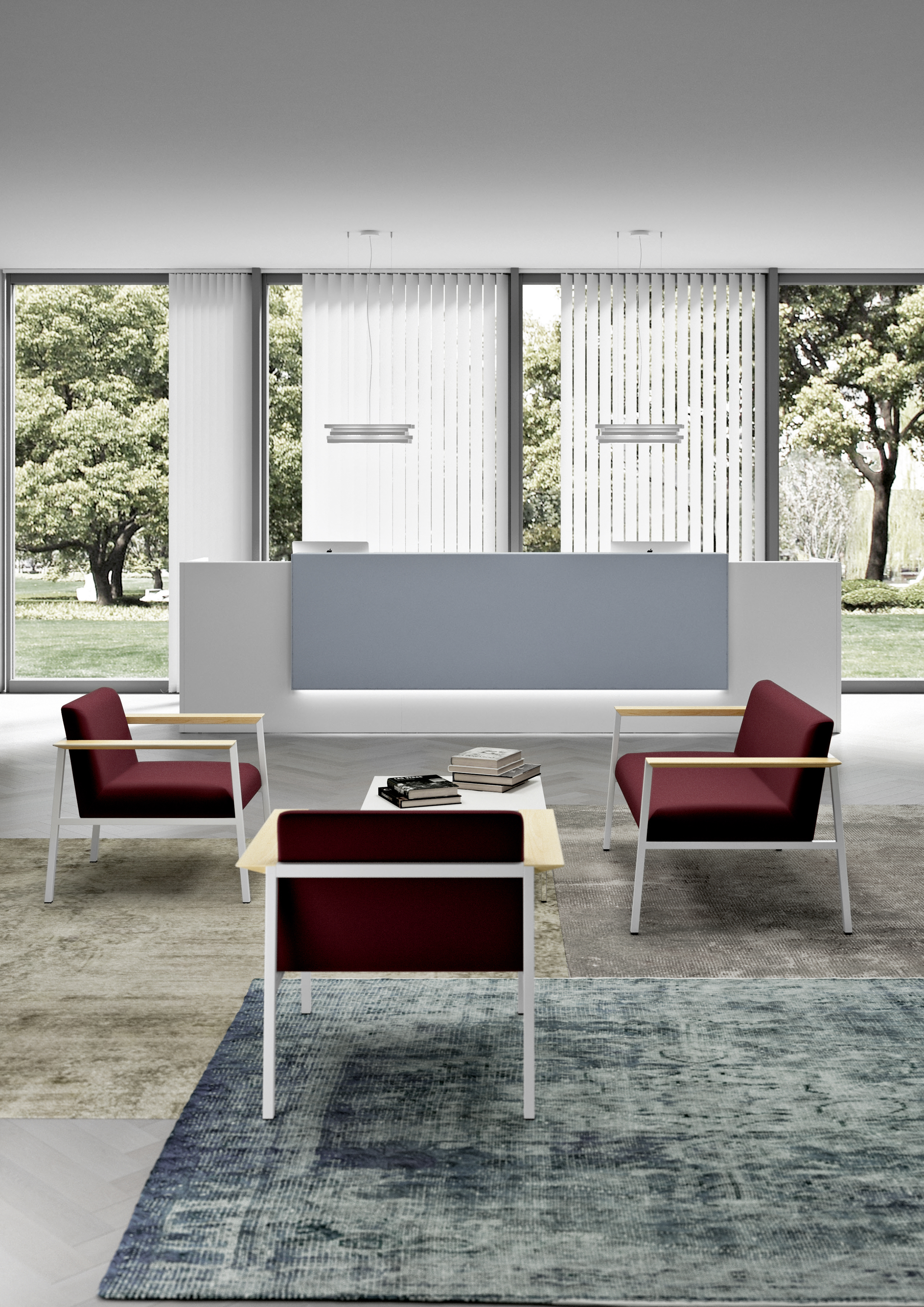 Subject: Structure in beech plywood. Upholstery in 100% fireproof M1 polyester fabric. Frame in white epoxy-coated steel tube. Polyethylene glides.