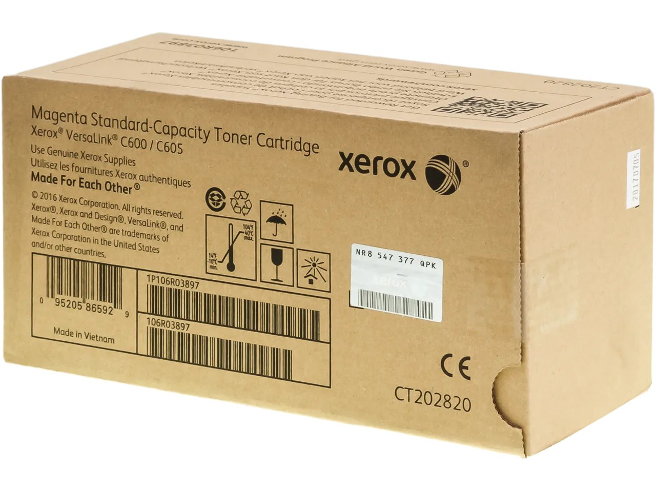 Xerox VersaLink C605 - Magenta - original - toner cartridge - for VersaLink C600, C605. Xerox Genuine VersaLink C600/ C605 Magenta Standard Capacity Toner Cartridge (6,000 pages)- 106R03897 is specially formulated and tested to provide the best image quality and most reliable printing you can count on page after page. Xerox Genuine Supplies and Xerox equipment are made for each other. Accept no imitations. Compatible toners may risk breakdown of Xerox printers and result in poor print quality and weak colours. With over 75 years' experience, Genuine Xerox Supplies are something you can rely on.