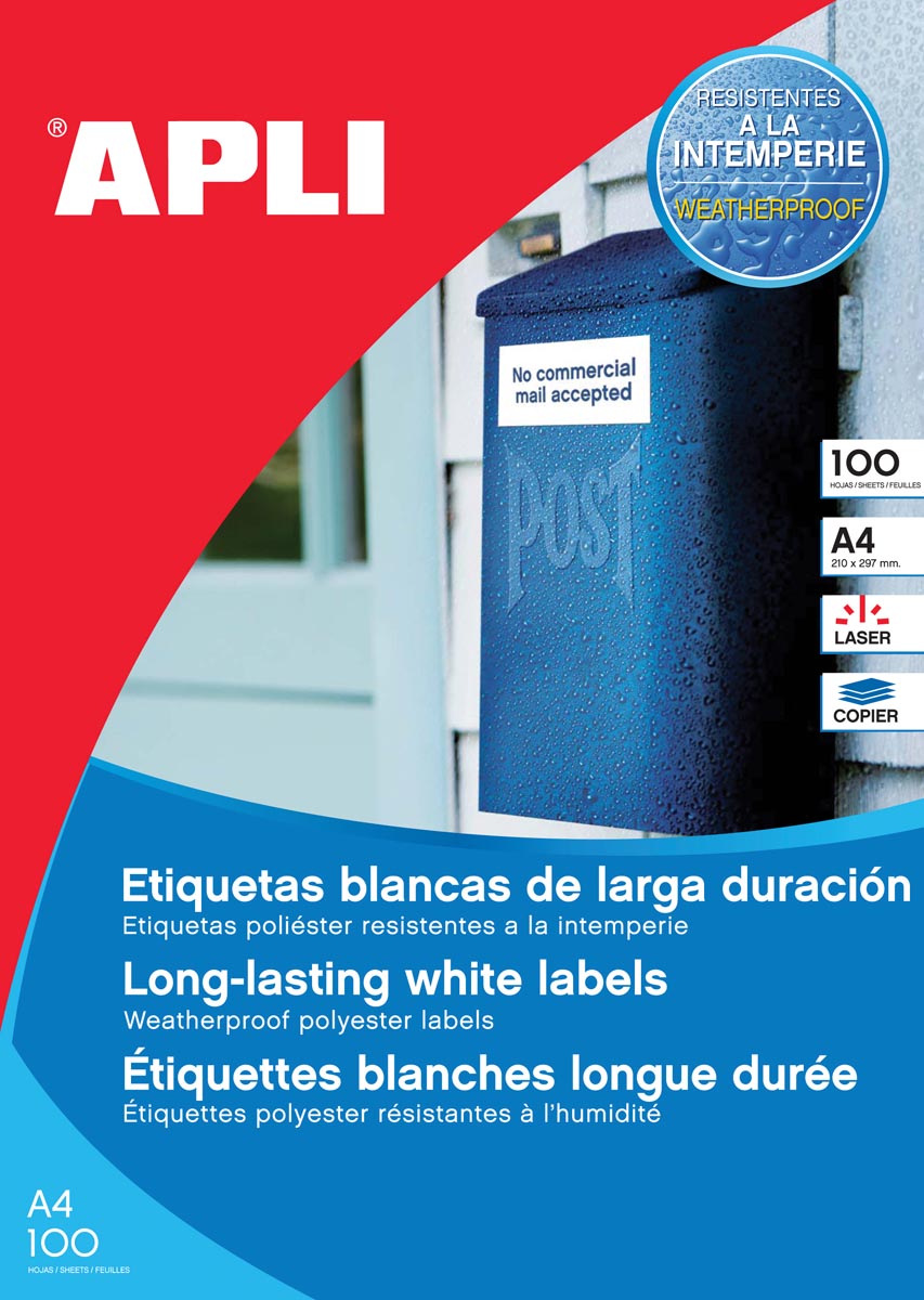Pour copieurs et imprimantes laser. Pour usage extérieur. Haute résistance à la déchirure et à l'humidité. Permet un étiquetage de longeu durée sur tout types de surface tels que le métal, plastique, verre et bois. Apllicables en extérieur. Couleur: blanc.Ft 21 x 29,7 cm (A4).