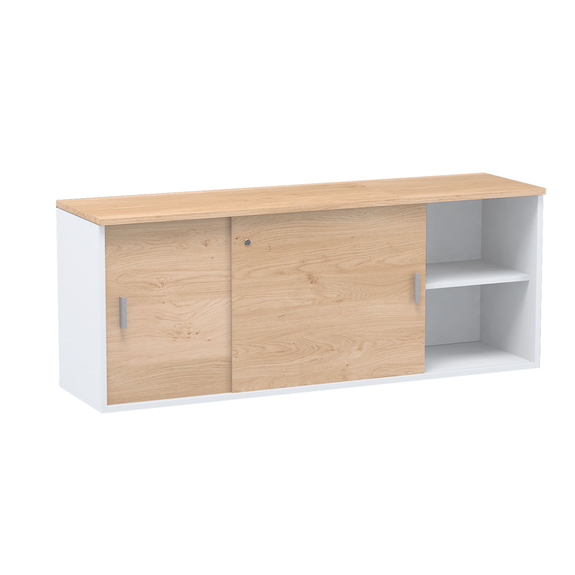 Panneaux de particules mélaminés. Cloison médiane formant 2 compartiments avec chacun 1 tablette amovible. Portes coulissantes avec serrure (2 clés fournies). Poignées métal alu brossé.