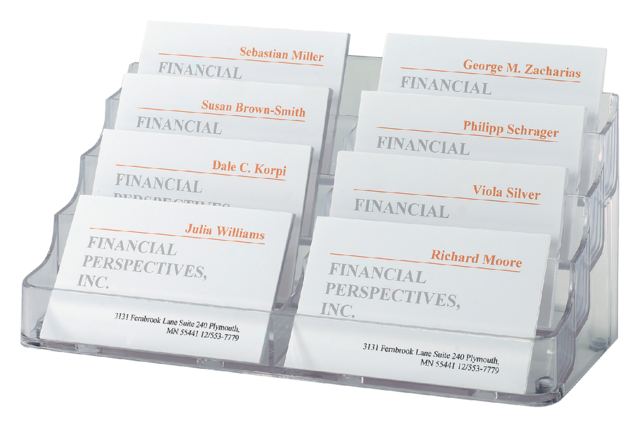 * Porte-cartes de visite en plastique rigide transparent de haute qualité. * Que ce soit à la foire, dans une salle d’exposition ou sur le comptoir de votre entreprise, ce porte-cartes de visite présente vos cartes de manière attrayante et bien rangé. * Pour cartes de visite d’une épaisseur jusqu`à 94mm. * Vos cartes de visite sont toujours visibles et accessibles à vos clients et visiteurs.