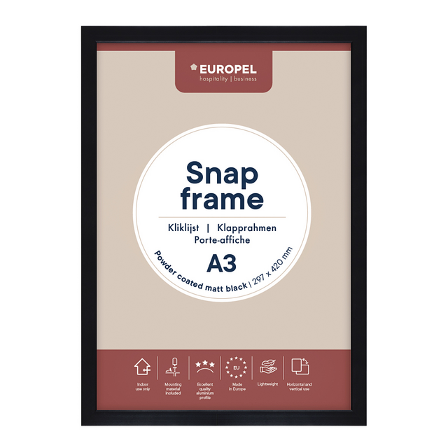 Donnez à vos affiches l'attention qu'elles méritent avec notre cadre clipsable revêtu d'une couche de poudre noire, la combinaison parfaite d'un design luxueux et d'une haute qualité. Qu'il s'agisse de présentations commerciales, d'affichages publicitaires ou de panneaux d'information, ce cadre clipsable assure un aspect élégant et professionnel.Pourquoi choisir notre cadre noir luxueux?* L'aspect luxueux et le design durable - Le cadre mat avec un profil unique dégage une grande classe et offre une résistance supplémentaire.* Changement ultra rapide grâce au système Easy-Click - Remplacez vos affiches en un rien de temps, sans outils.* Aluminium anodisé de qualité supérieure - Résistant aux rayures, robuste et conçu pour durer des années.* Clair et protégé - Le film frontal antireflet protège vos affiches de la saleté et de l'humidité, sans reflets.* Profil d'angle élégant - Une finition raffinée qui n'est pas seulement esthétique, mais qui offre également une stabilité supplémentaire.* Convient aux affiches A3 (29,7x42cm) - Idéal pour les bureaux, les magasins, les restaurants et les espaces publics.* Epaisseur du profil de 11mm - Design élégant et stylé qui s'intègre parfaitement dans une variété d'environnements.* Choix entre le noir intemporel et le blanc élégant - S'intègre parfaitement dans tous les intérieurs.* Montage facile - 4 vis et chevilles incluses pour une fixation sûre.