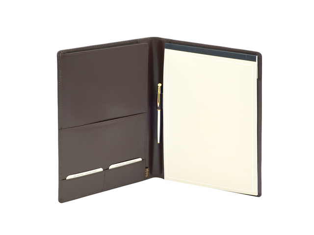 Description détaillée* Conférencier de luxe A4. * Avec rabat d'insertion A4, pochette A5 et 2 pochettes pour cartes de visite. * Boucle-stylo et insertion pour bloc-notes. * Dimensions 32,3x23,6cm.
