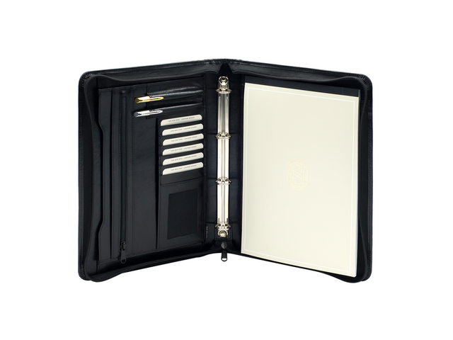 * Conférencier en joli cuir A4 à fermeture éclair et mécanisme 25mm. * Beaucoup d’espace de rangement. * Avec une grande et une petite pochette d’insertion et une large pochette zippée. * 6 compartiments pour cartes de visites et une pochette à fenêtre. * 2 larges boucle-stylos. * Insertion pour bloc-notes avec en-dessous une grande poche d’insertion. * Dimensions 350x270x45mm.