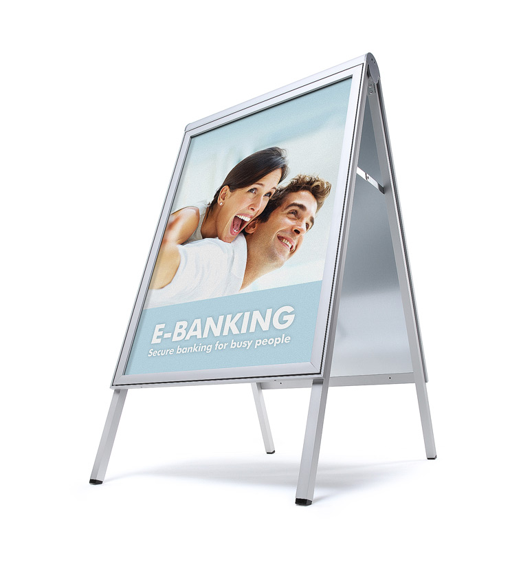 Faites sensation avec le panneau de trottoir COMPASSO®. Son design arrondi haut de gamme offre une stabilité remarquable tout en protégeant vos affiches des intempéries. Ce support visuel saisissant est idéal pour diffuser votre message de manière percutante. Attirez l'œil, éveillez la curiosité, augmentez la visibilité de votre emplacement et boostez votre promotion grâce au panneau de trottoir COMPASSO®.