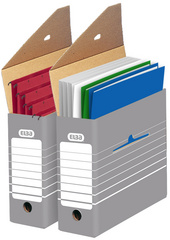Pour ft A4. En carton ondulé solide et sans acide. Montage automatique. Portrait. Compatible avec les boîtes à conteneurs Elba. Préimprimée pour indiquer le contenu. Gris avec impression en blanc. Certifié FSC.