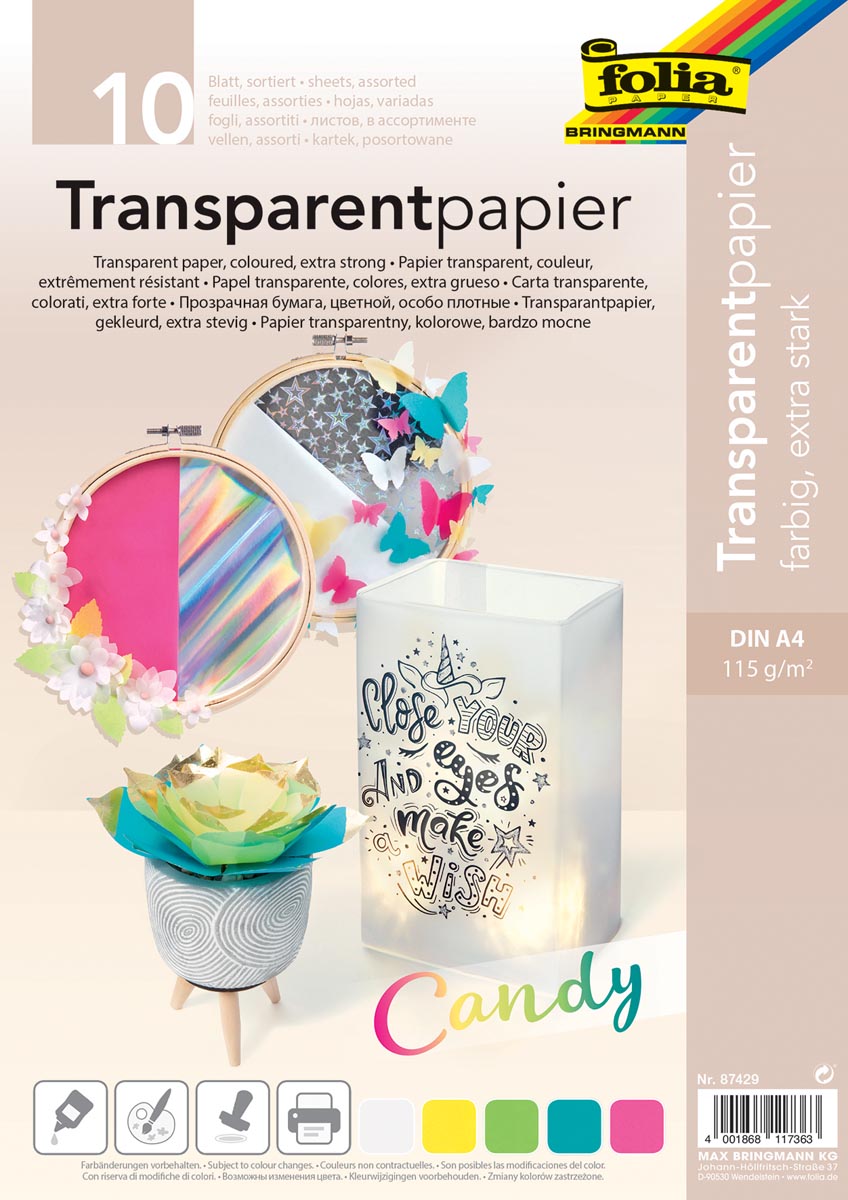N'attendez plus pour ajouter une touche de couleur et d'originalité à vos documents professionnels avec le papier transparent CANDY A4, 115 g/m2 de Folia.