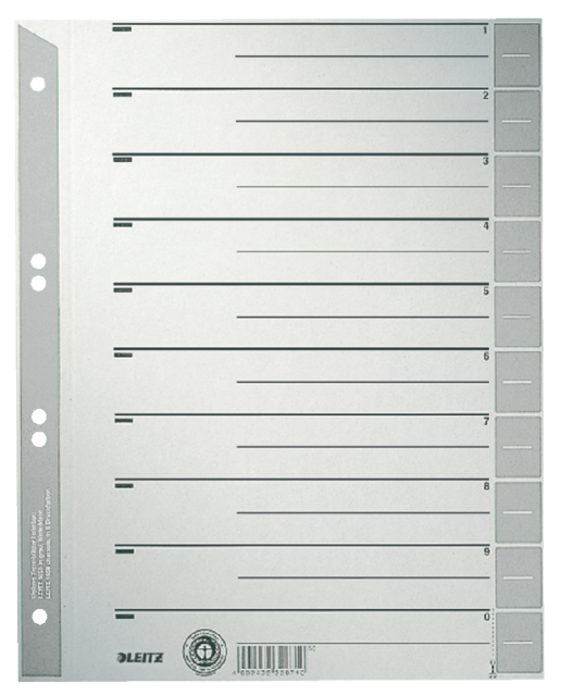 * Intercalaires en carton A4 pour les subdivisions dans les classeurs à levier ou à anneaux. * Convient pour 2 ou 4 anneaux. * Page de garde avec ligne imprimée. * Onglets vierges inscriptibles. * Avec perforations renforcées. * Les différents intercalaires peuvent être découpés. * Carton kraft 230 g/m². * Avec label Ange Bleu.