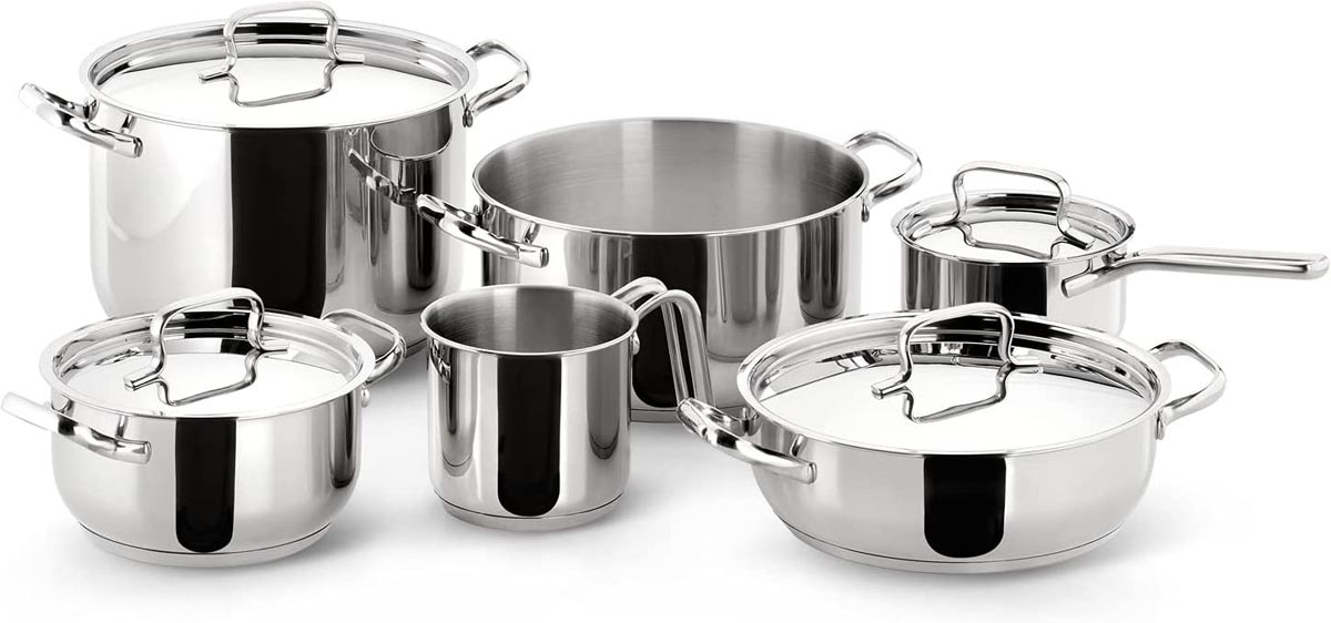 En acier inoxydable Lavable au lave-vaiselle Pour tous les types de plaques de cuisson set de 10 pièces: - 1 x casserole haute, 22 cm - 1 x casserole, 18 cm - 1 x casserole, 24 cm - 1 x sauteuse, 24 cm - 1 x casserole, 14 cm - 1 pot à lait, 12 cm - 4 x couvercle, 14/18/22/24 cm