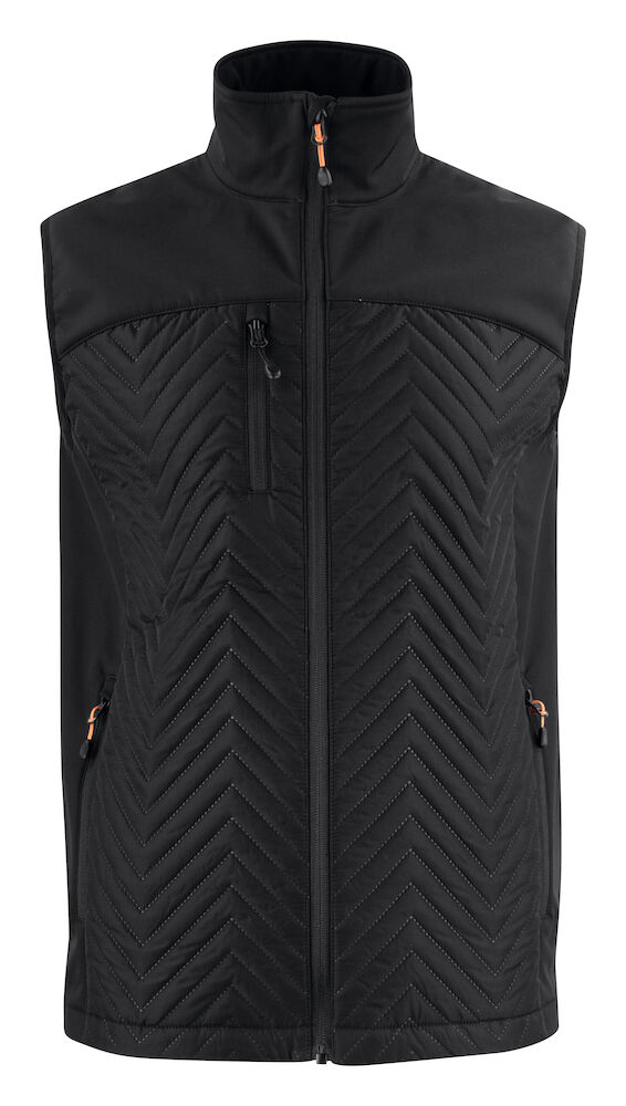 Bodywarmer softshell/matelassé façon doudoune. Parties latérales et col en softshell (tissu 1). Intérieur de la veste en micropolaire sur les parties latérales et le col. Face avant et dos avec coutures en chevron (tissu 2). Une poche poitrine et deux poches latérales zippées. Tires-zips de couleur contrastée sur le zip principal et les poches latérales. Dos de la veste plus long pour une meilleure protection. Tire-zip poche poitrine de couleur noire.