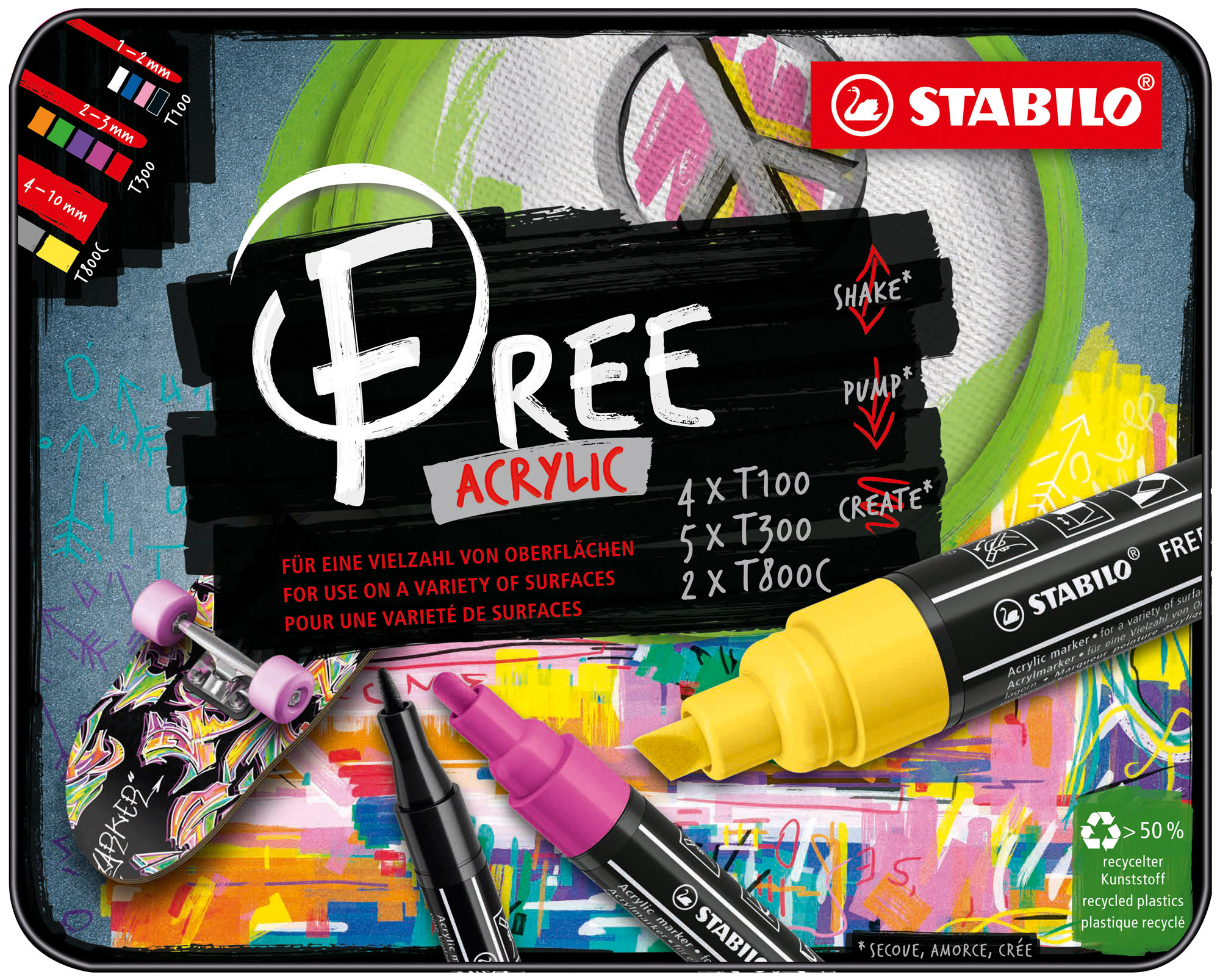 Personnalisez de nombreuses surfaces (du papier à la pierre en passant par la céramique, le cuir, le tissu, le métal, le verre ou le bois). L'encre acrylique à base d'eau est très opaque et permet de couvrir toutes les surfaces. La couleur lorsqu'elle est humide, peut être mélangée ou diluée avec de l'eau pour en atténuer l'intensité et créer de nouvelles teintes. Une fois l'encre sèche, elle peut être recouverte par une autre couleur et permettre ainsi des effets de superposition. Enfin, en imbibant largement la pointe d'encre puis en soufflant dessus ou en tapotant sur le corps du marqueur, on peut réaliser des effets de spray similaires à une bombe de peinture. Sur les surfaces très lisses, l'utilisation d'un vernis fixatif est recommandée pour fixer les couleurs durablement Donner libre cours à votre créativité avec les marqueurs STABILO FREE Acrylic, ils sont très faciles à utiliser. Amorcez le stylo en le secouant au moins 30 secondes, capuchon fermé, puis pompez pour faire descendre l'encre dans la pointe... Vous êtes prêts à créer !