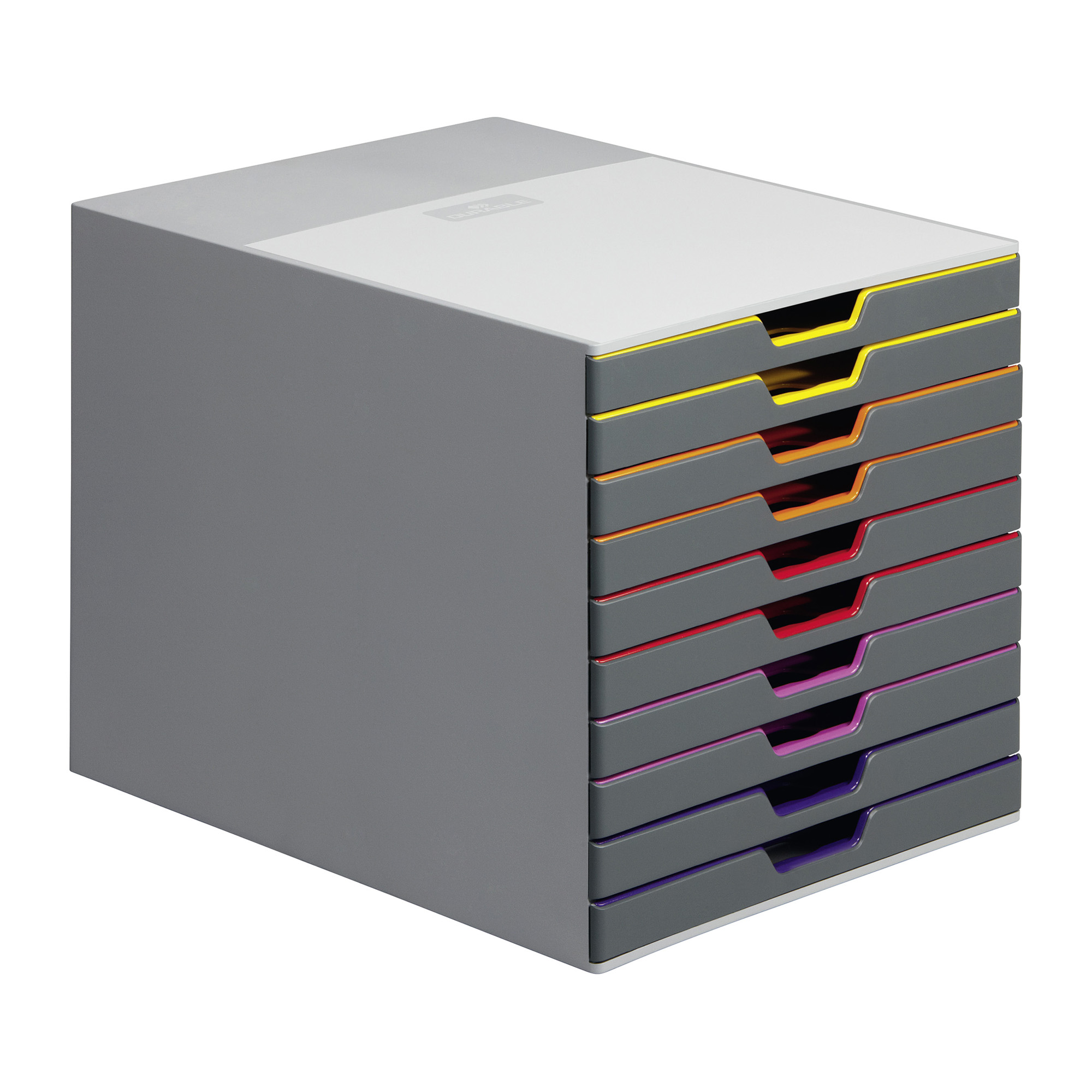 Module de classement à tiroirs : composé de 10 tiroirs facilement identifiables grâce à leur couleur dédiée et au porte-étiquette, pour organiser efficacement vos documents A4+.