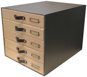 Description détailléeTrieur à tiroirs en carton recyclé, 5 tiroirs, pour formatA4 maximum, poignées en cuir noir et porte-étiquettes
