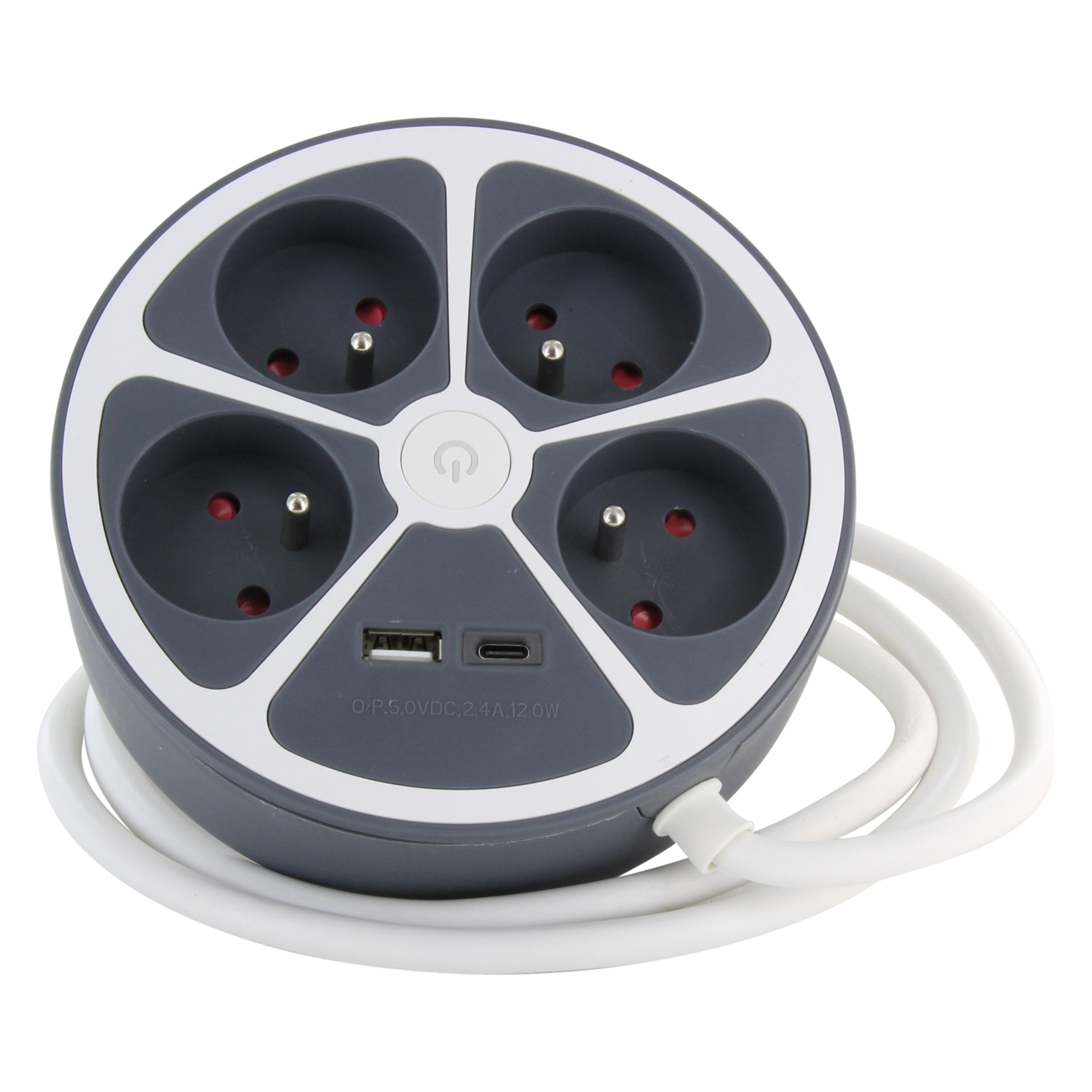 Description détailléeBranchez vos appareils électriques et luminaires en toute élégance avec cette multiprise. Grâce à sa forme circulaire, l'ensemble des prises sont visibles et accessibles sans aucune gêne.Forme ronde design4 prise FR (avec terre)2 ports USB type A et type CUtilisation intérieure Couleur : Gris