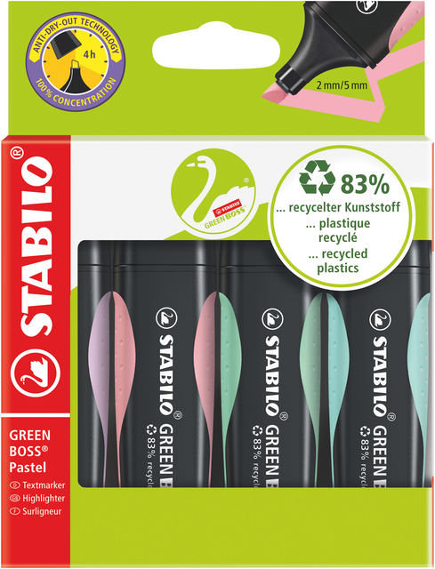 La pochette de 4 surligneurs GREEN BOSS Pastel est donc l'outil incontournable pour les professionnels souhaitant allier performance, esthétisme et respect de l'environnement dans leur quotidien. Faites le choix d'un produit adapté à vos besoins et engagé pour la planète avec les surligneurs GREEN BOSS Pastel de Stabilo.
