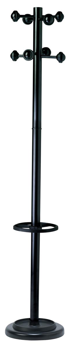 8 patères renforcées décalées, arrondies pour ne pas déformer les vêtements, munies d'un rebord anti-glisse. Porte-parapluies réglable en hauteur (capacité: 9 parapluies). Robuste et très stable, d'une belle finition. Tête tournante pour faciliter l'accrochage des vêtements, même si le portemanteau est situé dans un coin du bureau. Grand bac égouttoir. Hauteur: 175 cm. Pied: diamètre 34 cm. Couleur: noir