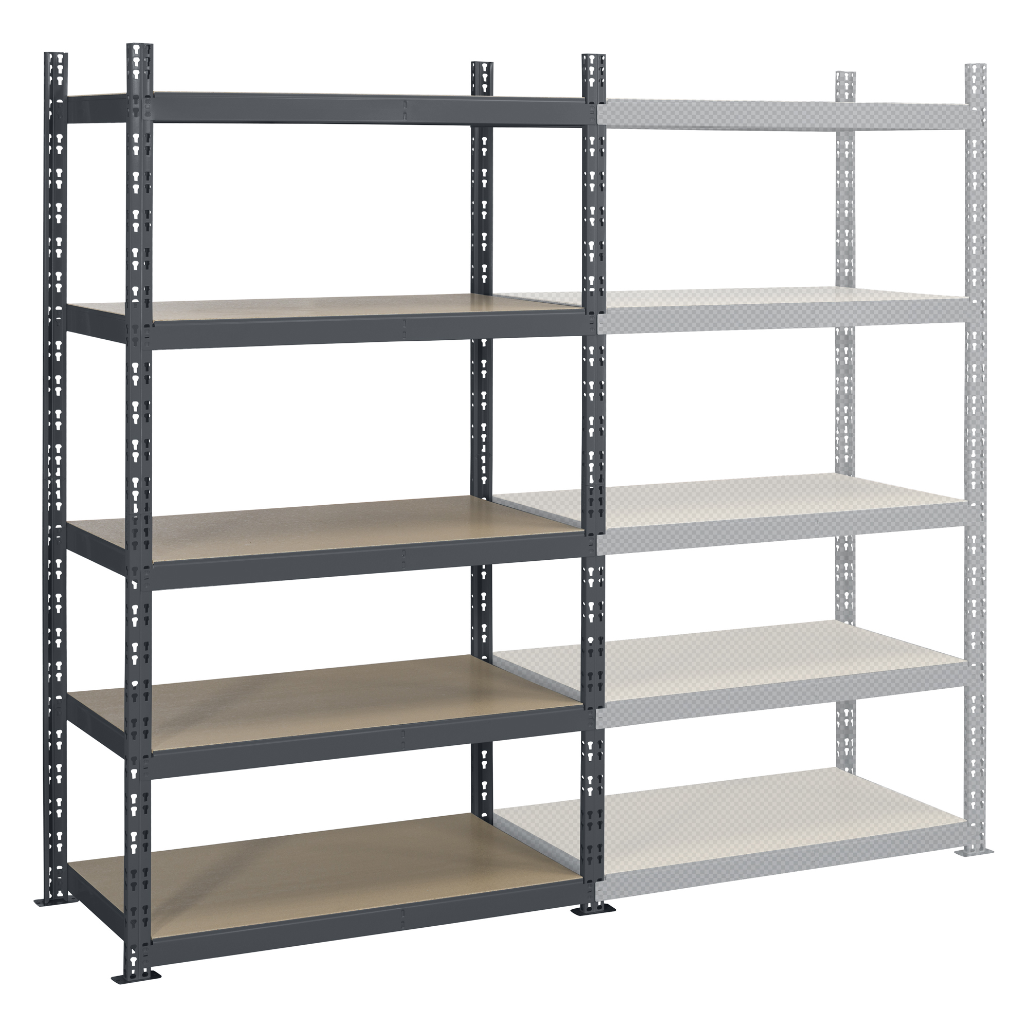 Structuur: gemaakt van staalplaat met een dikte van 7/10e. Gegalvaniseerde structuur. Plaatjes voor bevestiging aan de vloer meegeleverd. Voor een optimale opberging zijn de rekken uitgerust met buisvormige legplanken(=liggers), die elke 2,5 cm in de hoogte aangepast kunnen worden, uitgerust met isorelplanken 8 mm. Aantal liggers: 5.