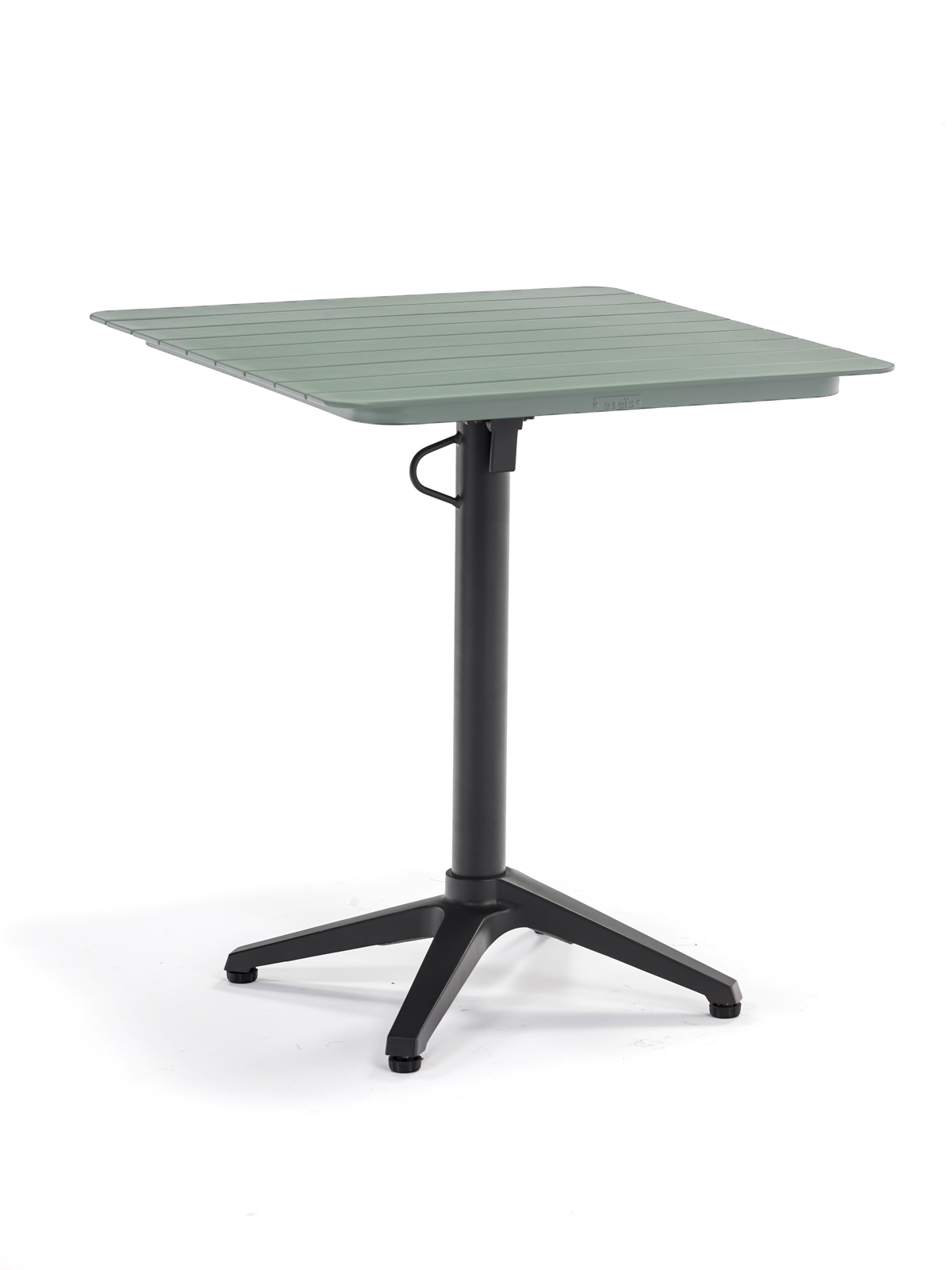 Bistrotafel Layon. Aluminium blad en gegoten aluminium onderstel, verstelbare glijders onder de poten. Draaibaar tafelblad voor gemakkelijk opbergen. Verzwaarde voet voor goede stabiliteit. Antidiefstal ring voor het doorvoeren van een ketting of kabel. Ontworpen voor buitengebruik, zeer resistent. Kan gecombineerd worden met de Dive stoelen. Zelfmontage. Hoogte: 75 cm. Afmetingen tafelblad: 67 x 67 cm.