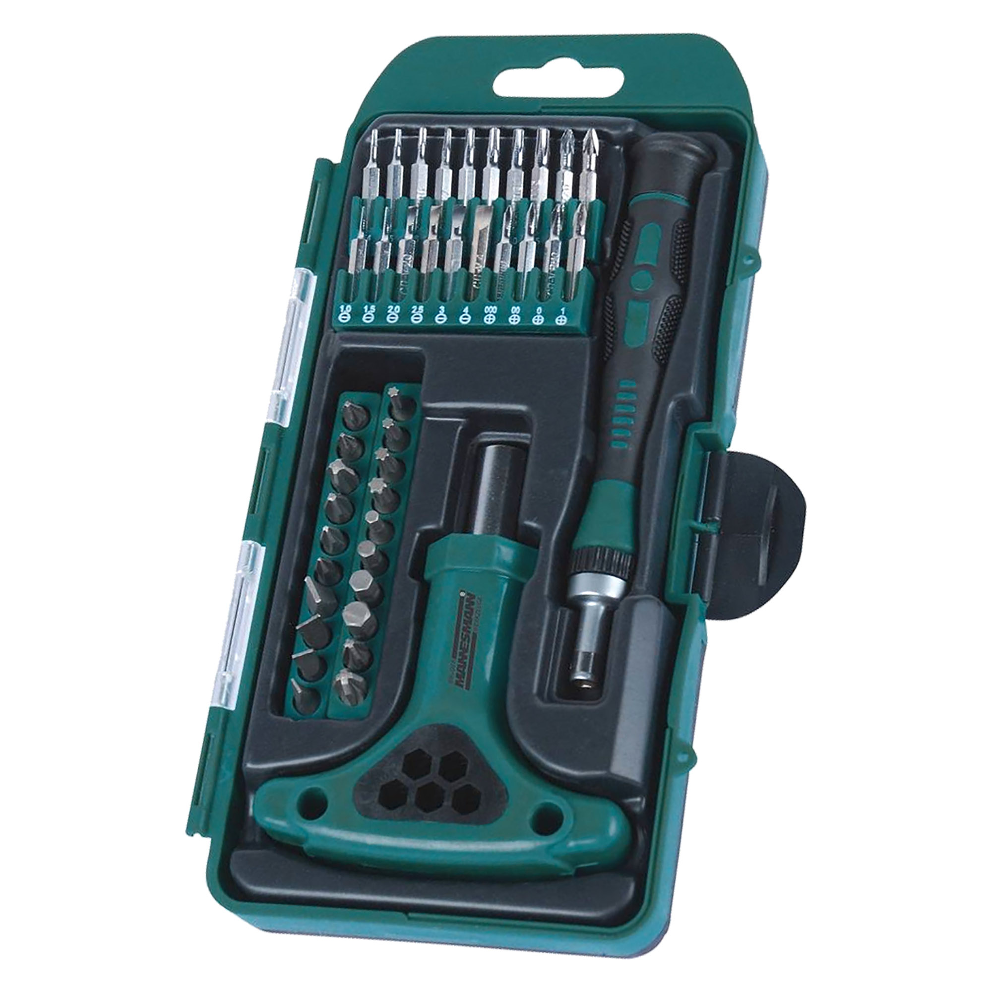 ProductinformatieCassette met transparant deksel, gewicht: 450 g. Inhoud: precisie ratelschroevendraaiergreep, vuistratelbitschroevendraaiergreep, 40 bits. Gemaakt van chroom vanadium staal.