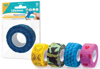 ProductinformatieMateriaal: PE, zacht voor de huid, ademend, waterbestendig, beschermt wonden en fixeert kompressen, latexvrij, met de hand scheurbaar, afmetingen: 25 mm x 4,0 m, assortiment in geel, groen, blauw en roze met motieven voor kinderen.