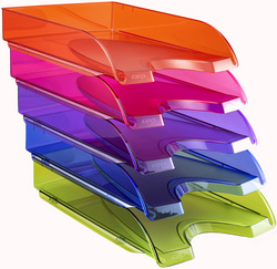 ProductinformatieIn polystyreen, stapelbaar, met brede sleuf, passend in dekleuren: vermiljoen, indiaas roze, paars, bamboegroen,elektrisch blauw, afmetingen: (L)345 x (D)260 x (H)64 mminhoud: 5 stuks(200 + H*5 / 1020050811)