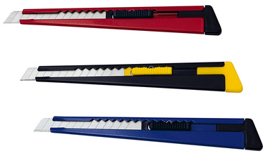 ProductinformatieMetalen mesgeleider, schuif, geïntegreerde mesbreker,geleverd met 2 reservemesjes, assorti in verchroomde kleuren: blauw, rood, zwart - geen speciale kleurkeuze mogelijk,afmetingen: (L)140 x (D)10 x (H)21 mm.