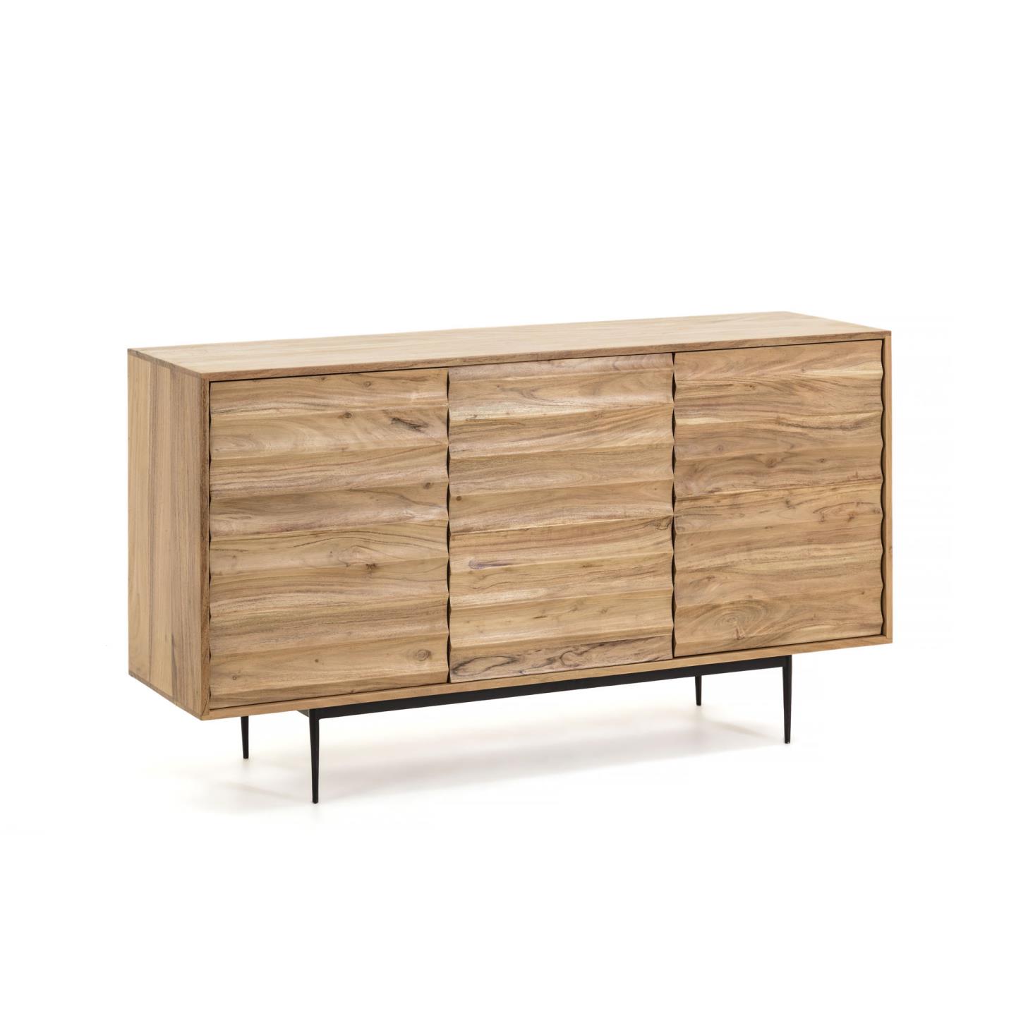 De structuur van de Delsie servieskast is gemaakt van massief natuurlijk acaciahout en heeft een natuurlijke afwerking. Hij is met de handgemaakt. Ook het decoratieve detail van de deuren is met de hand gemaakt, waardoor een origineel effect van verschillende dieptes ontstaat. De poten zijn gemaakt van zwart gelakt metaal, een perfecte afwerking om te combineren met dit hout. Als u een exclusief meubel wilt hebben, heeft u het al gevonden.