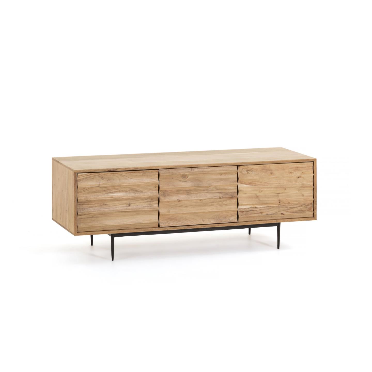 Met een natuurlijke afwerking is de structuur van de Delsie TV-meubel gemaakt van massief natuurlijk acaciahout. Het is een handgemaakt stuk. Ook het decoratieve detail van de deuren is met de hand gemaakt, waardoor een origineel effect van verschillende dieptes ontstaat. De poten zijn gemaakt van zwart gelakt metaal, een perfecte afwerking om te combineren met dit hout. Als u een exclusief meubel wilt hebben, heeft u het al gevonden.
