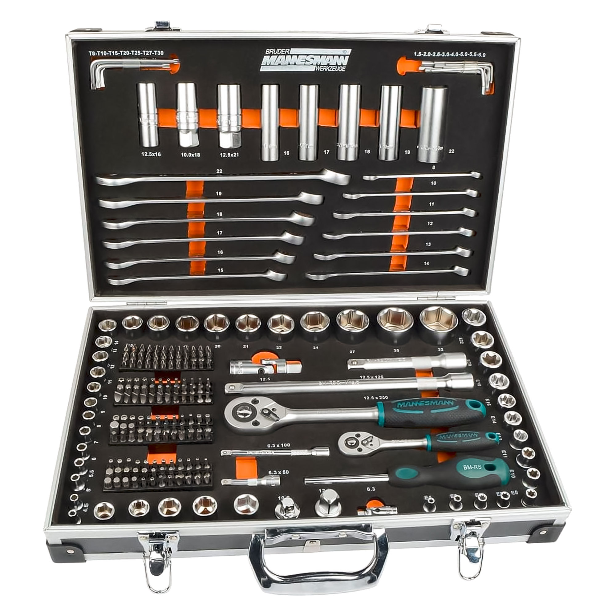 Inhoud: 144 boren, magnetische bitschroevendraaiergreep, 12 verstelbare moersleutels, 3 bougiedoppen, 47 dopsleutels, 4 verlengstukken, 2 adapters, 2 kniegewrichten, 15 haakse stiftsleutels, 2 ratels met omschakelpal, afmetingen: (B)455 x (D)305 x (H)110 mm.