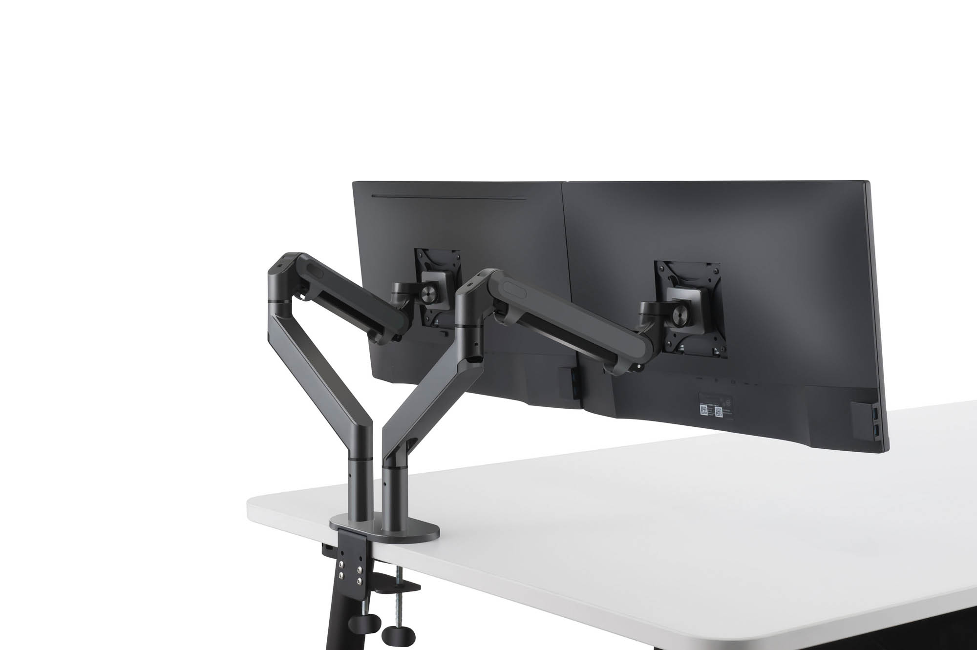 Deze dubbele, mobiele scharnierarm van Jamy biedt een optimale gezichtshoek en een uniek comfort. Met deze arm kunt u de oriëntatie, de helling en de hoogte van uw scherm probleemloos wijzigen. Zorg zo voor een optimaal visueel comfort, terwijl u tegelijk minder kans heeft op vermoeide ogen of rup-en nekpijn.
