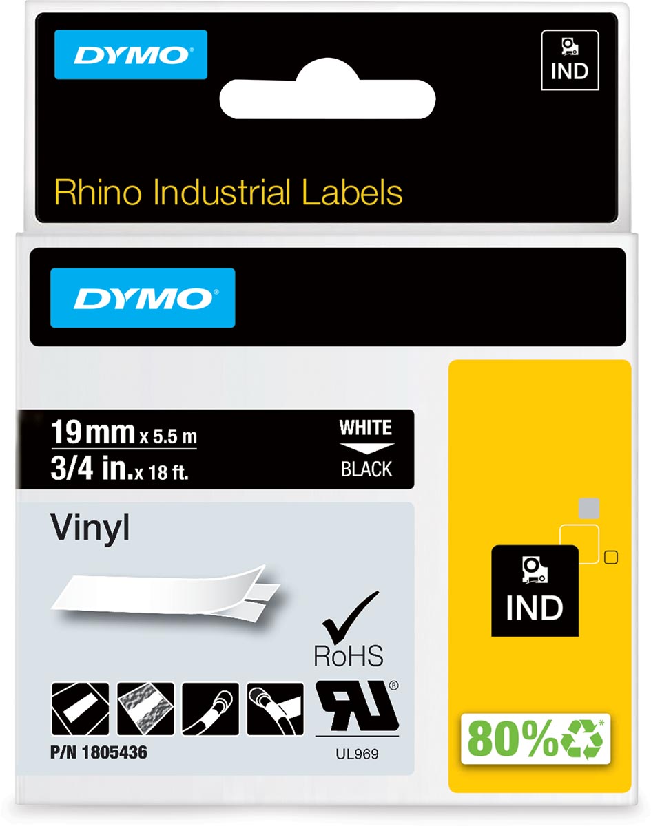 Dymo RHINO vinyltape 19 mm, wit op zwart
