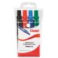 ProductinformatiePermanente inkt met oplosmiddel. Ronde metalen behuizing. Tot 1000 m schrijflengte. Schuine punt, kleur zwart. Lijn: 3,9-5,5 mm. Hoesje met 4 geassorteerde kleuren: zwart, blauw, rood en groen. Product zonder PVC.