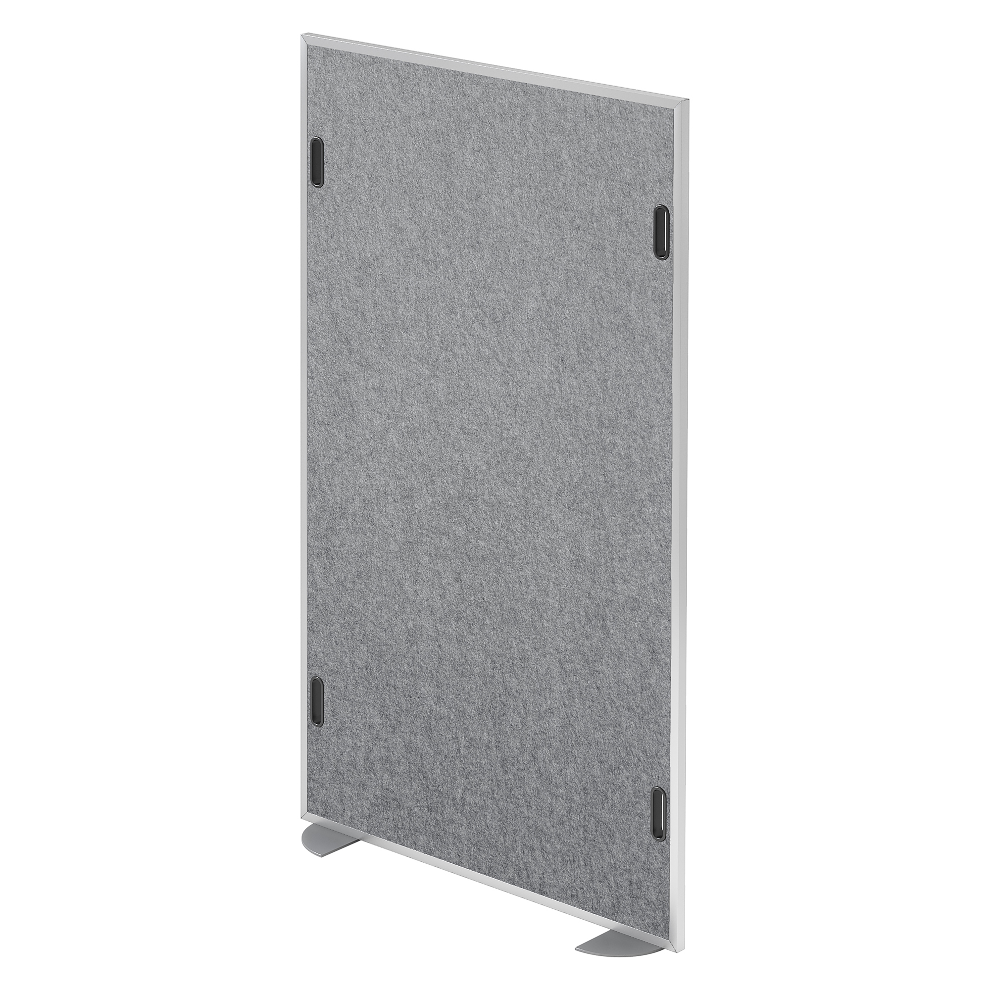 Paneel van geluidsabsorberende vezels, 25 mm dik, grijs gevlekt, viltachtig. Moeilijk ontvlambaar, conform DIN 4102 (B1), met geluidsbescherming van categorie C. Met kader in aluminium, volledig er rond, 27 x 25 mm. 4 gaatjes voor een eenvoudige aanpassing en voor de montage van een speciaal scharnier. Met klittenband voor de verbinding van verschillende panelen. Afmetingen: B 166 x D 2,7 x H 98 cm. Geleverd met 2 steunvoeten en 2 scharnieren.