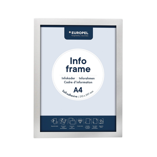 * Zelfklevend kader voor een glasheldere presentatie. * Document eenvoudig verwisselbaar dankzij de magnetische randen. * Herpositioneerbare zelfklevende transparante folie. * Zowel staand als liggend te gebruiken. * Geschikt voor gladde ondergronden. * Tweezijdige presentatie op glas. * Kaderkleur aan tweezijden zichtbaar. * Verpakt per 2 stuks. * Geschikt voor papierformaat A4 297x210mm. * Zichtbaar 289x202mm. * Buitenmaat 325x238mm. * Breedte kader 18mm.