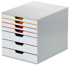 ProductinformatieIn ABS-kunststof, met 3 grote en 4 kleine lades, voorformaat tot A4, C4, evenals folio en enveloppen,antislippads, fijne gekleurde rand, kleur:grijs / kleur rand,afmetingen: (B)292 x (D)356 x (H)280 mm.