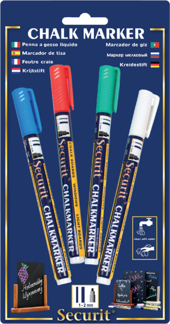 * Krijtmarker met ronde punt. * Geurneutrale vloeibare inkt op waterbasis. * Met een vochtige doek te verwijderen van bijna alle gladde oppervlaktes. * Ideaal voor gebruik op krijtborden, glas en ramen. * Schrijfbreedte 1-2mm. * Kleuren: wit, blauw, groen en rood.