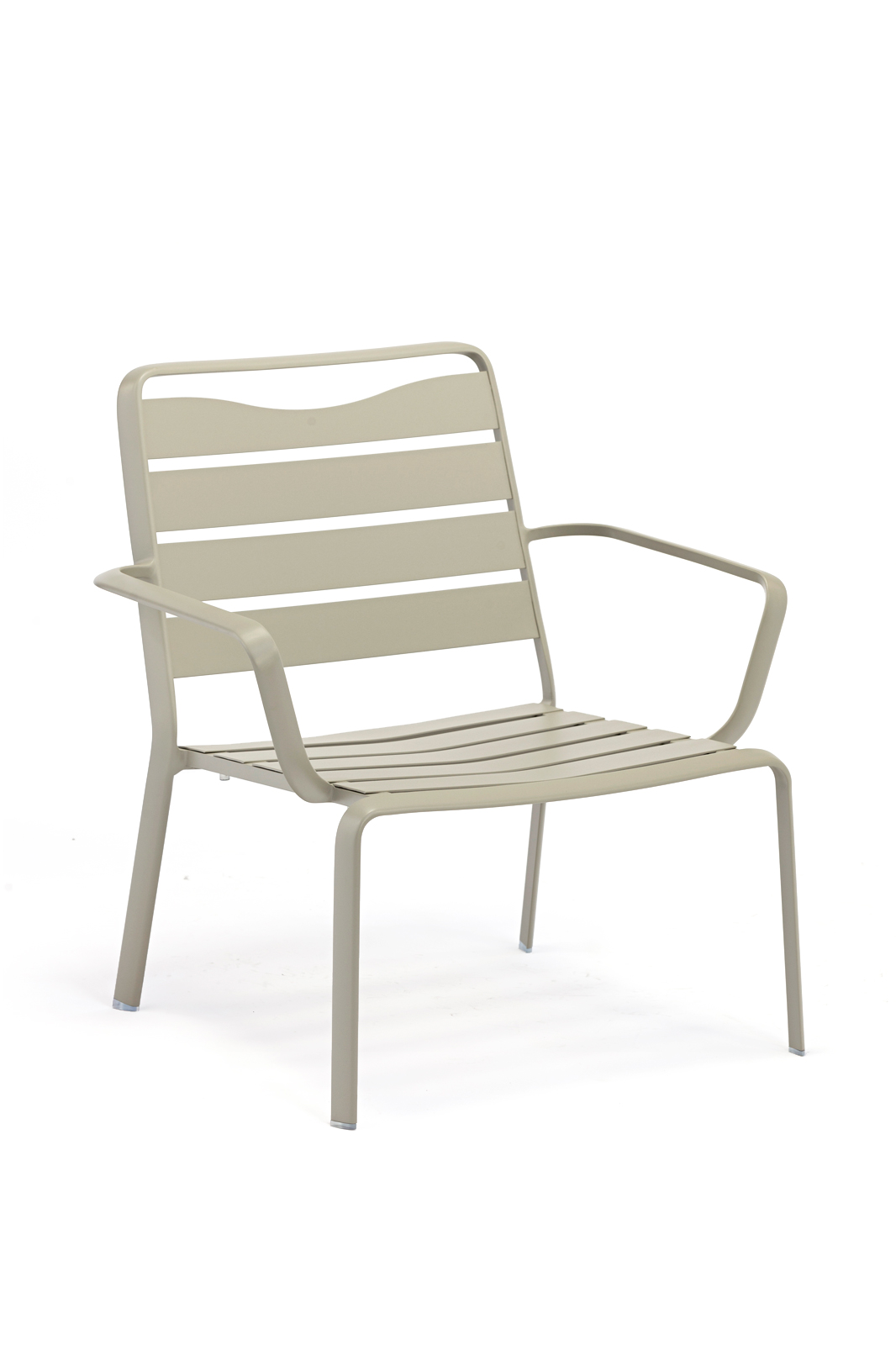Dive lage tuinstoel met armleuningen in aluminium. Een warm product met gebogen en geruststellende vormen. Volledig gemaakt van aluminium, met steengrijze poedercoating, licht en resistent. Stapelbaar voor gemakkelijk opbergen.