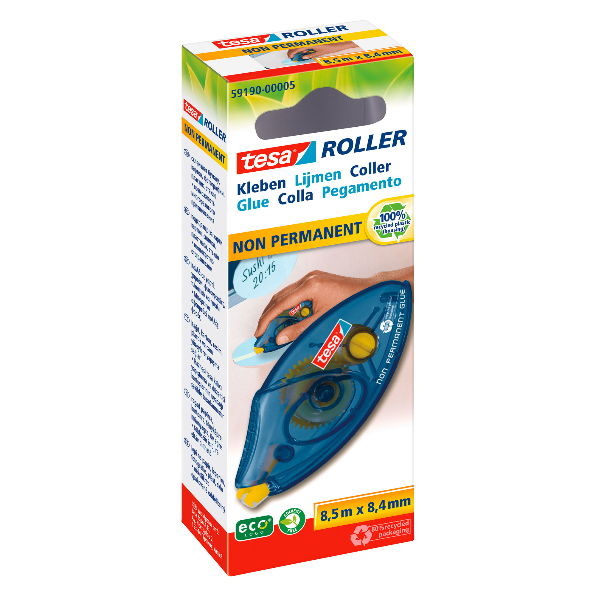 ProductinformatieGemakkelijk te gebruiken dankzij het geel kleefmiddel, zodat u kunt zien waar u de lijm aangebracht heeft. 100% gerecycleerd plastic, verpakking in gerecycleerde karton (80%).Zonder oplosmiddel.Wegwerpbare roller.